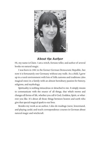 About the Author Hi, my name is Claire. I am a witch, fortune teller, and author of several books on natural magic. I was born in 1981 in the former German Democratic Republic, but now it is fortunately one Germany without any walls. As a child, I grew up in a rural environment with lots of folk customs and traditions (also magical ones) in a family with an almost hereditary passion for history, religions, and mythology. Spirituality is nothing miraculous or detached to me. It simply means to communicate with the source of all things, that which moves and changes all forms of life, whether you call it God, Goddess, Spirit, or whatever you like. It’s about all those things between heaven and earth who give that special magical spark to our lives. Besides my work as an author, I also do readings (tarot, lenormand, and playing cards) and teach correspondence courses in German about natural magic and witchcraft.