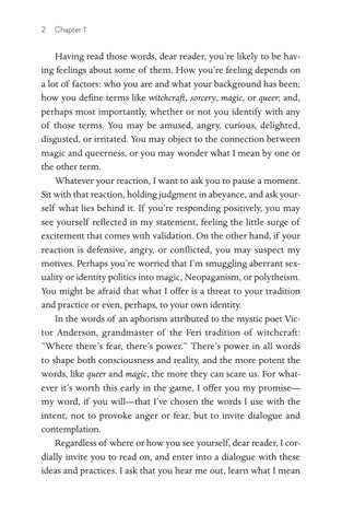 Having read those words, dear reader, you’re likely to be having feelings about some of them. How you’re feeling depends on a lot of factors: who you are and what your background has been; how you define terms like witchcraft, sorcery, magic, or queer; and, perhaps most importantly, whether or not you identify with any of those terms. You may be amused, angry, curious, delighted, disgusted, or irritated. You may object to the connection between magic and queerness, or you may wonder what I mean by one or the other term. Whatever your reaction, I want to ask you to pause a moment. Sit with that reaction, holding judgment in abeyance, and ask yourself what lies behind it. If you’re responding positively, you may see yourself reflected in my statement, feeling the little surge of excitement that comes with validation. On the other hand, if your reaction is defensive, angry, or conflicted, you may suspect my motives. Perhaps you’re worried that I’m smuggling aberrant sexuality or identity politics into magic, Neopaganism, or polytheism. You might be afraid that what I offer is a threat to your tradition and practice or even, perhaps, to your own identity. In the words of an aphorism attributed to the mystic poet Victor Anderson, grandmaster of the Feri tradition of witchcraft: “Where there’s fear, there’s power.” There’s power in all words to shape both consciousness and reality, and the more potent the words, like queer and magic, the more they can scare us. For whatever it’s worth this early in the game, I offer you my promise— my word, if you will—that I’ve chosen the words I use with the intent, not to provoke anger or fear, but to invite dialogue and contemplation. Regardless of where or how you see yourself, dear reader, I cordially invite you to read on, and enter into a dialogue with these ideas and practices. I ask that you hear me out, learn what I mean