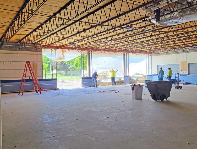 The floor tile has been removed and the cement floor ground smooth in the cafeteria. While the new caf space will extend south, the existing cafeteria will be remodeled and ready for students when school starts in August. The 2,600 ft2 caf addition is to be complete before the end of the calendar year.
