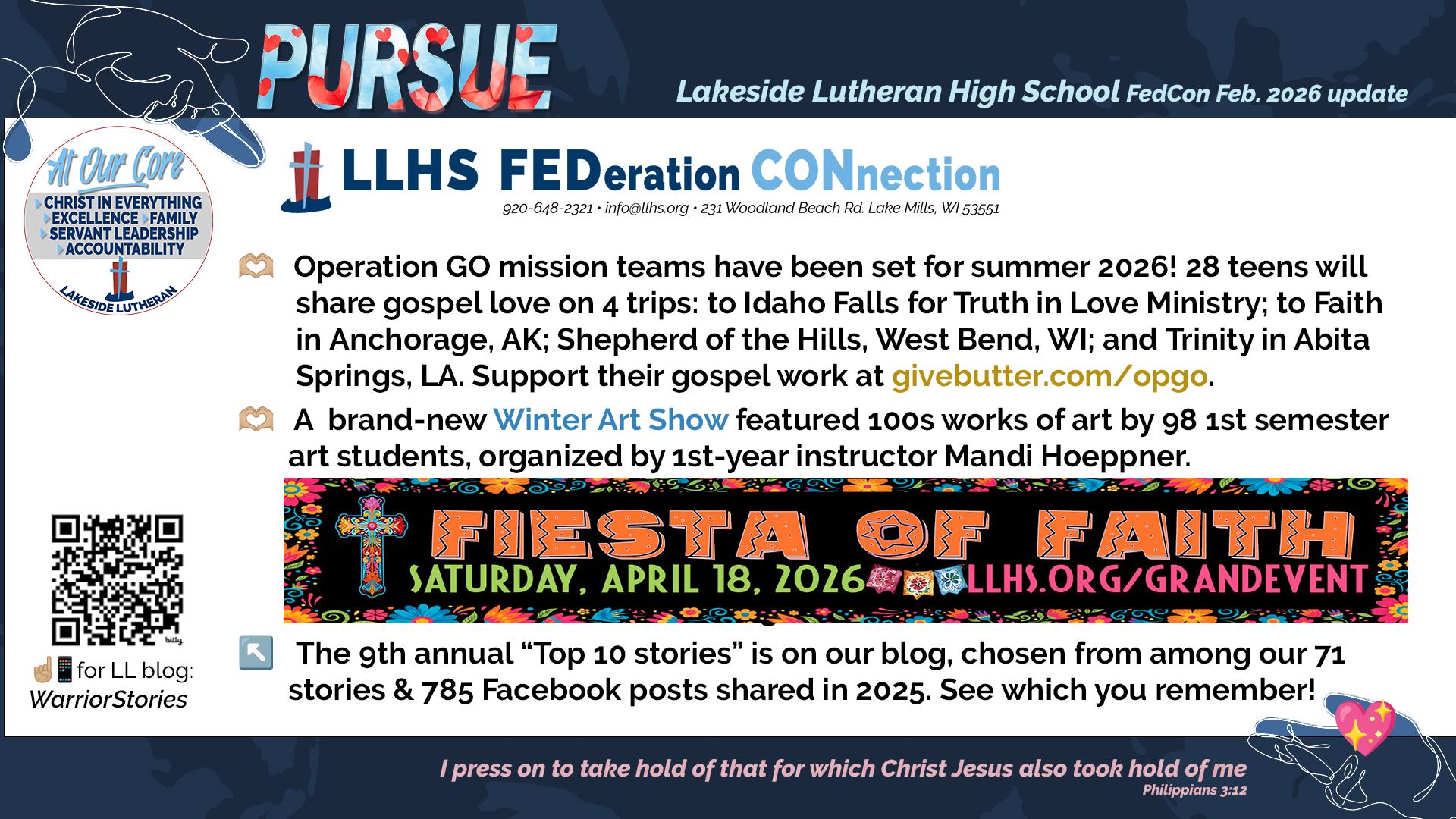 26.02 LLHS Federation Connection: February means 2nd semester is in full swing. Our monthly news slide is emailed to supporting churches in the LL federation and beyond. This month shares summer plans for Operation GO mission trips, ticket and sponsorship opps for our 15th annual Grand Event, plus a new art show and recap of 2025's "top 10" LL stories at llhswarriorstories.wordpress.com/2026/01/07/top-10-ll-stories-of-2025/