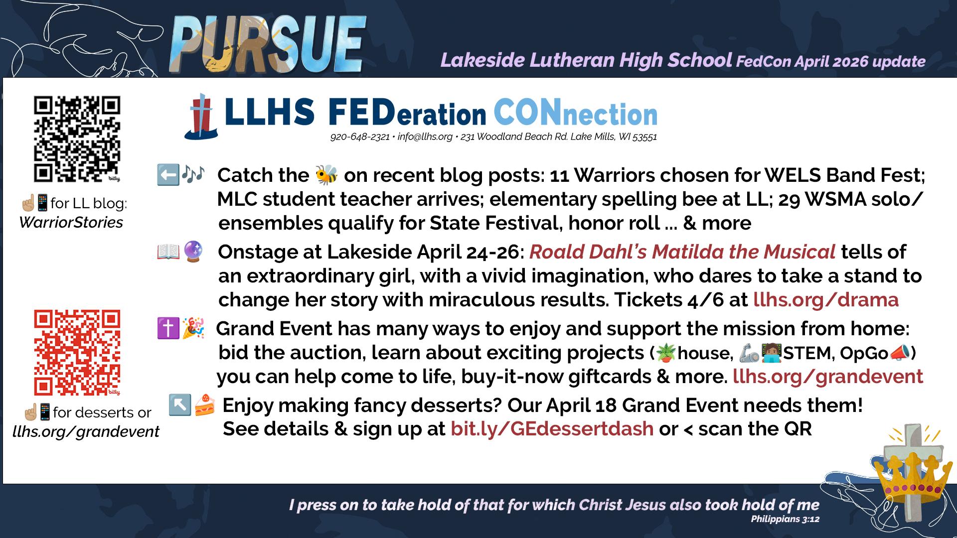 26.04 LLHS Federation Connection: April's news slide, emailed to supporting churches in the LL federation and beyond, reminds fans that our blog features lots of great Warrior stories, that tickets for Roald Dahl's Matilda the Musical are coming April 7, and that EVERYONE can be involved in our Grand Event! (Hover and tap on links in the slide to be taken to webpages)