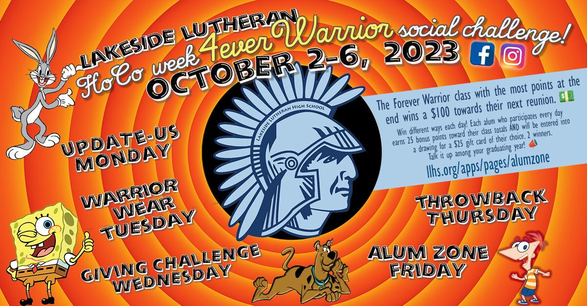 Join the Forever Warrior Social Media Challenge to connect and win The FW class with the most points after October 6 wins $100 towards their reunion. Win different ways each day! Some days also bring gifts and drawings for $25 gift cards. See more details when you scan the QR or go to llhs.org/apps/pages/alumzone. Talk it up among your graduating year!