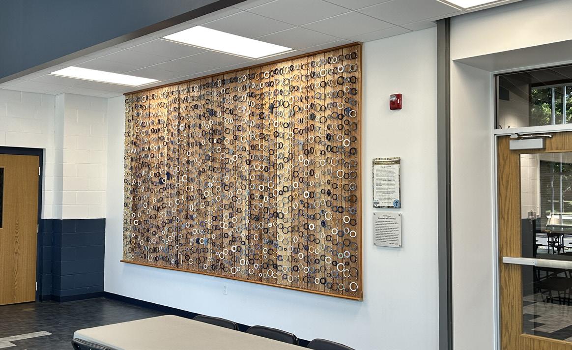 Industiral Arts teacher, Caleb Kasper ‘98, guided his Woods classes in repurposing the last planks from the original west gym bleachers into the canvas for the new south cafeteria art display.