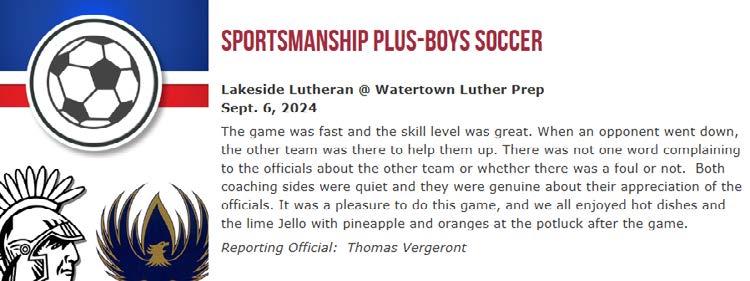 As part of the WIAA effort to “assist membership schools with their citizenship and sportsmanship efforts for students,” the association encourages officials to report examples they witness that display unusual sportsmanship. Your Lakeside Lutheran received two shining reports this fall: