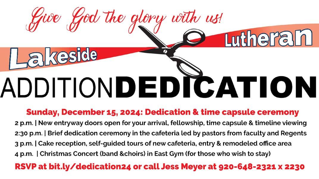 At 2:30, Principal Schultz and other pastors will lead a brief dedication ceremony in the cafeteria, after which the doors to the new cafeteria will be opened for a cake reception and self-guided tours of that space, as well as of the new entry and remodeled office area. Lakeside adminstration will be present to answer questions. At 4 p.m. all guests are welcome to attend the concert in the East Gym.