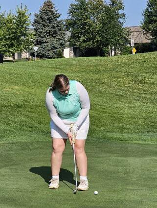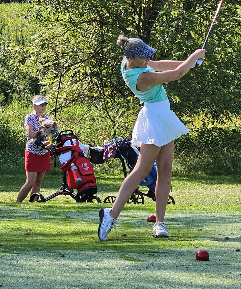 Left: Bella gives a good drive. Right: Tessa Schmocker lines up her putt.