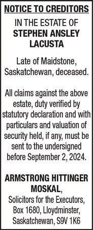 If you have a claim against this estate, you must file your claim by: September 9, 2024 with: ROSS A. CLEMENTS of CLEMENTS & SMITH at: Box 440 Lloydminster, SK S9V OY4