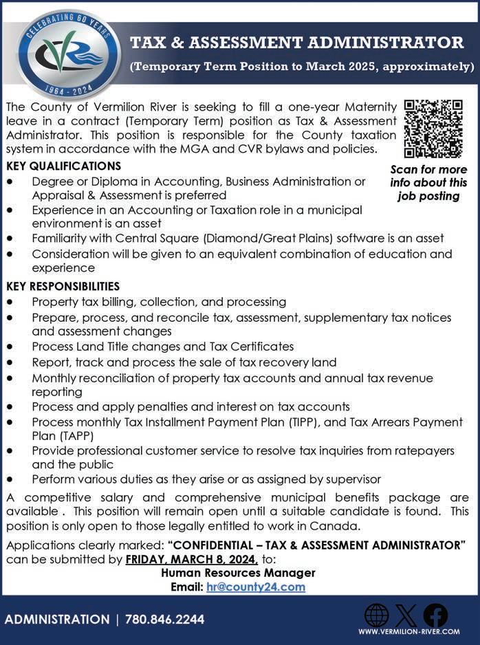 Applications stating experience, wages, and three work related references, along with a valid driver’s license, current driver’s abstract and criminal records check must be received by March 12th, 2024.
