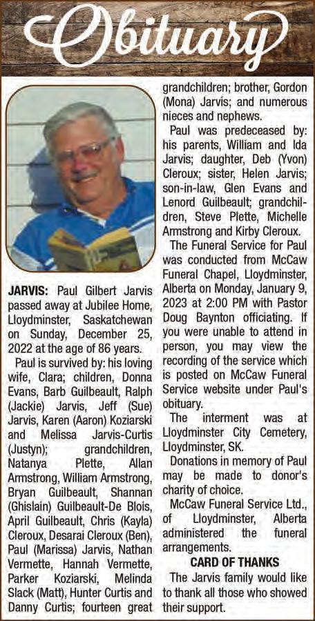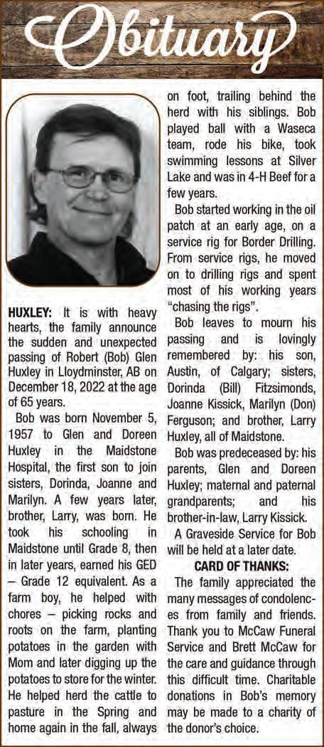 Sports PAGE 17 Thursday, January 19, 2023 MERIDIAN SOURCE HOUSE FOR SALE Located in Maidstone, SK • Two bedroom • One bathroom • New insulation • New siding • New windows • New dryer/washer & stove • Large yard with mature ower beds • Two storage sheds • Quiet town with many amenities • House is located walking distance to Main Street, restaurants and other businesses. Message or call Brenna at (306) 893-7603 NEW PRICE $95,000 HEATED SHOP BAYS FOR RENT West of Kitscoty, AB (HWY 16, Range Road 35) • 5,000 SQ. FT. SHOP • 4 BAYS • GRAVEL FLOOR • 16’ X 16’ AUTOMATIC DOORS Call Al for more information 780-205-1184 Major points weekend for ‘Cats