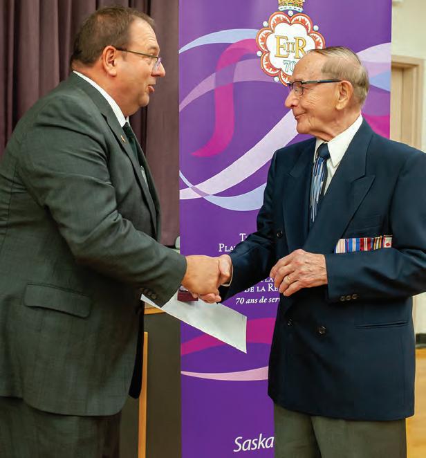 Left: Mayor Gerald Aalbers presents Mr. Lloydminster, Vic Juba, with the Queen Elizabeth II Platinum Jubilee Medal on Sunday afternoon at the Legacy Centre. Centre: Lloydminster MLA Colleen Young presents Lloydminster Region Health Foundation CEO, Stephanie Munro, with the Queen Elizabeth II Platinum Jubilee Medal.