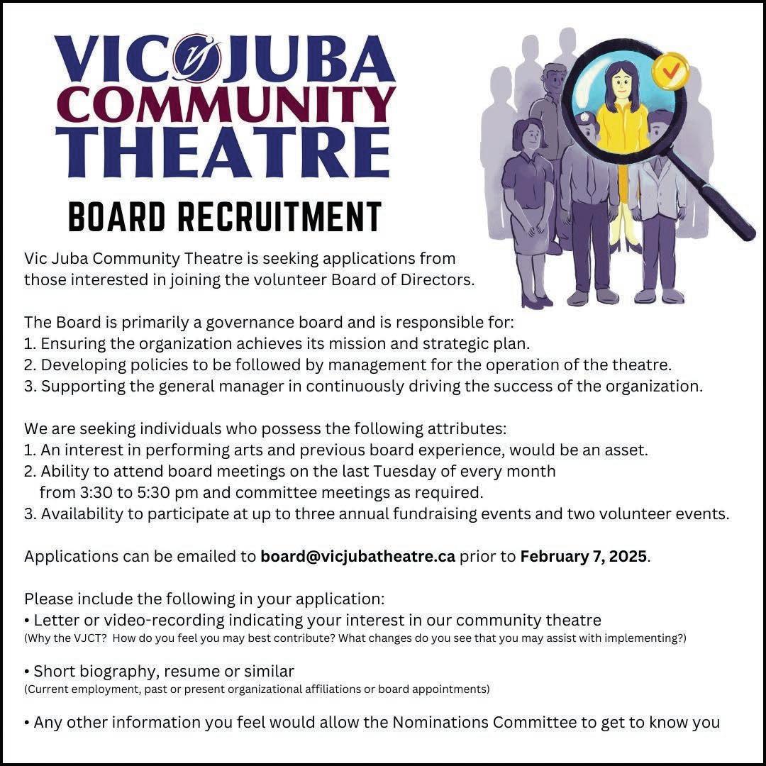 Applications can be emailed to board@vicjubatheatre.ca prior to February 7, 2025