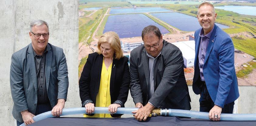 Vermilion-Lloydminster-Wainwright MLA Garth Rowswell, Lloydminster MLA and Sask Advanced Education Minister, Colleen Young and Nathan Neudorf, Sask’s Minister of Affordability and Utilities, were all smiles on Tuesday afternoon as Mayor Gerald Aalbers ceremoniously put the City of Lloydminster’s longawaited wastewater treatment plant online by turning a valve.