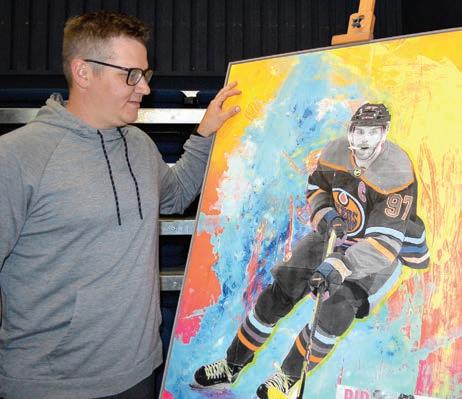 Geoff Lee Meridian Source Lloydminster Public School Division Art Academy teacher, Derek Kappel, at College Park School, checks out a collaborative painting of Edmonton Oilers captain Connor McDavid at the academy’s public art show last Thursday. Two McDavid pieces were auctioned off to raise funds for the program next year.