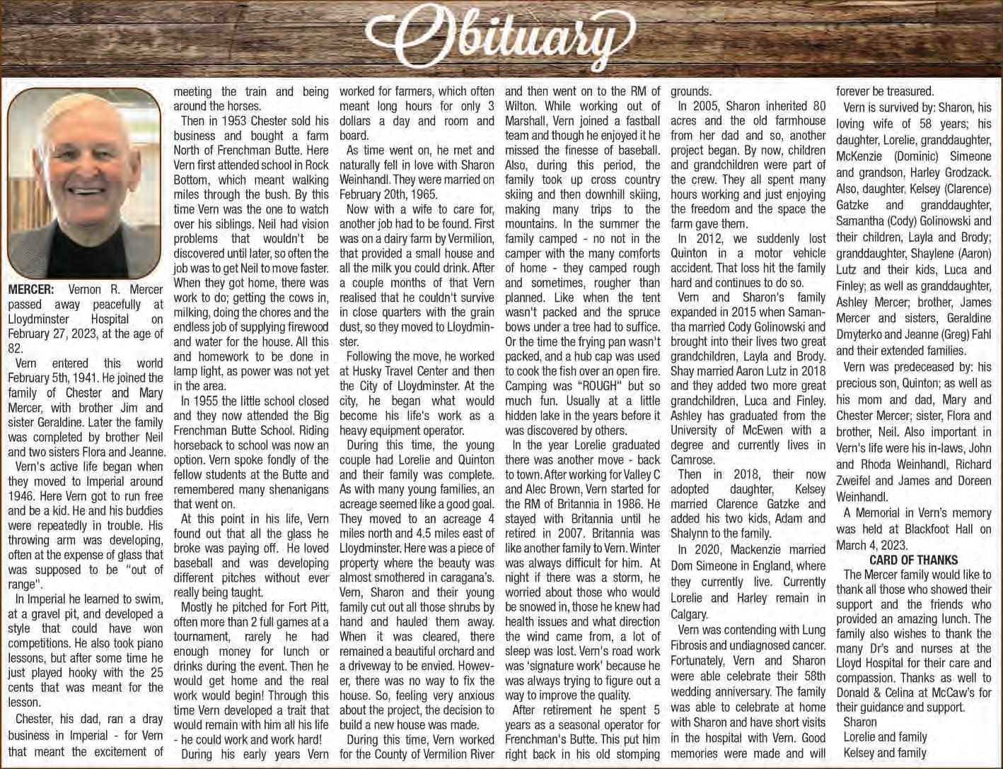 Funeral services were held in Dewberry, AB on February 21, 2023.