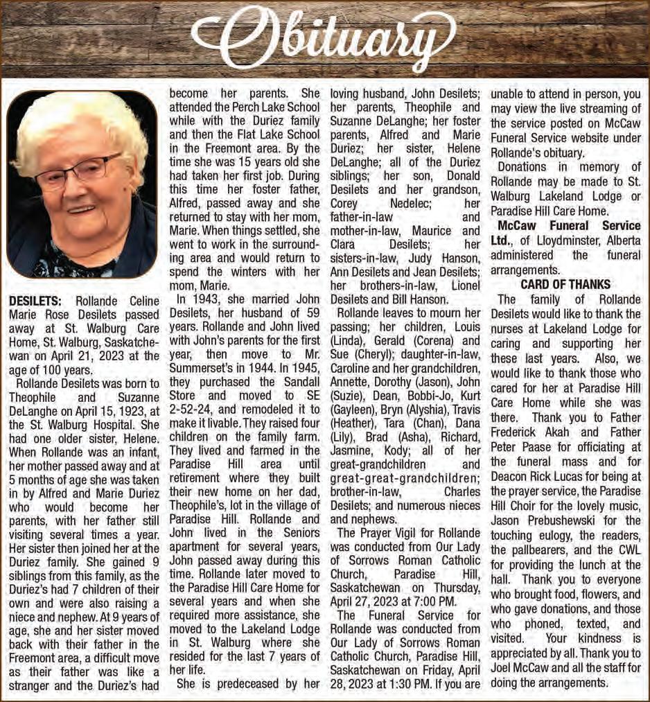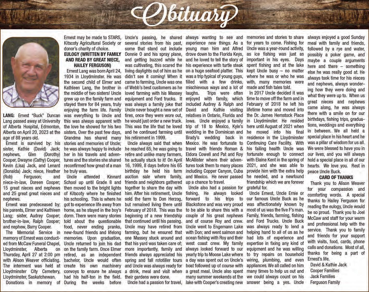 A funeral service was held on Saturday, May 6, 2023, at Rosebud Church at 2:00 p.m. To send condolences, please visit Bob’s obituary at www.wheatlandfuneralhome.ca