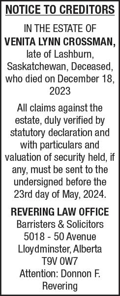 ALL CLAIMS against the above Estate, duly verified by Statutory Declaration and with particulars and valuation of security held, if any, must be sent to the undersigned before the 6th day of June, 2024.