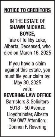 In the estate of ERNEST MANFRED KASTENDIECK late of Lloydminster, Saskatchewan, deceased. All claims against the above estate, duly verified by statutory declaration and with particulars and valuation of security held, if any, must be sent to the undersigned before June 16, 2025