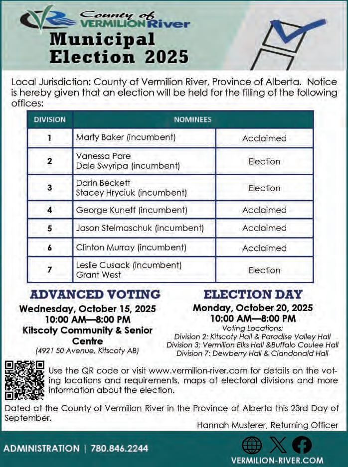 Election day voting will take place at the Bonnyville Seniors Drop-In Centre from 10 a.m. to 8 p.m.