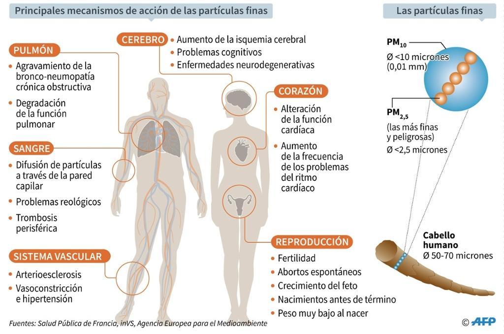 ✓ Las partículas de menos de 2,5 micrómetros (PM2,5) tienden a penetrar en el de intercambio de gases de las regiones del pulmón, y las partículas muy pequeñas (<100 nanómetros) pueden pasar a través de los pulmones y afectar a otrosórganos.