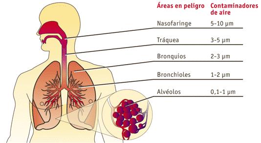 En general, las partículas más pequeñas pueden viajar más profundamente hacia el sistema respiratorio. Las partículas más grandes son atrapadas en la parte superior del sistema respiratorio produciendo una nariz tapada y una garganta irritada. Las partículas finas (con diámetros menores a 10 μm) llegan hasta los alveolos, los sacos de aire en donde se lleva a cabo el intercambio de oxígeno y dióxido de carbono dentro del sistema cardiovascular. Las partículas finas se acumulan con exposición repetida, ensuciando la superficie de intercambio en los sacos alveolares, por lo que la respiración se vuelve cada vez más difícil. Es por esto por lo que las nuevas normas de la calidad del aire, llamados indicadores PM2,5, se crean enfocadas en las concentraciones ambientales y de emisión de partículas finas. Es menos claro qué riesgo se plantea por las partículas ultrafinas (aquéllas con diámetros menores a 0,1 μm). Se creía que estas partículas son tan pequeñas que tienen fuerza de impacto insuficiente como para dañar los sacos alveolares y son simplemente exhaladas. Ahora, las investigaciones sobre la salud sugieren que algunas de estas partículas pueden, de hecho, pasar con el aire a través de los alveolos, incorporarse en el torrente sanguíneo y afectar a muchos órganos.
