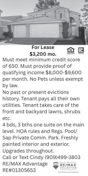 $1,995.00 monthly plus security deposit. Water, Trash, Sewage included. Tenant pays all other utilities. Must have good credit. One-year lease. Please contact (909) 794-7944 with