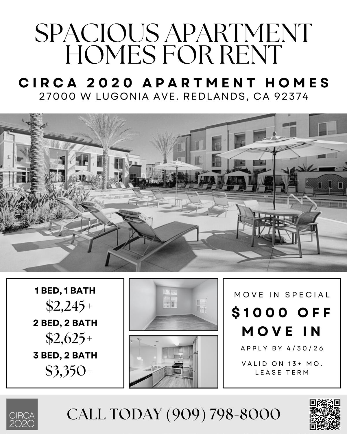 TWO BEDROOM, 2.5 bath townhome for rent. Two master suites. Ideal for residents, students, or young families. Attached garage with electric charging. 3.5 miles from hospital, walkable to Grove Farmer’s market. $2,600.00, available July 1st. For pictures and information call or text (845) 3893379. May1 410 Glenwood Dr. Redlands. House for lease, one bedroom, one bath. Hardwood floors, two AC units, washer and dryer, shared backyard and garage. Walk to downtown. $1,800.00 monthly. Good credit, no pets. Lease one or two years! Call (951) 809-8664. May1