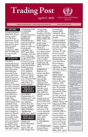 Advertising accepted for publication is intended to be a service to students, staff, employees, and faculty of Loma Linda University Health. The management, at its sole discretion, reserves the right to refuse, without explanation, any advertisement, as well as make any edits or deletions to the submitted advertisement.