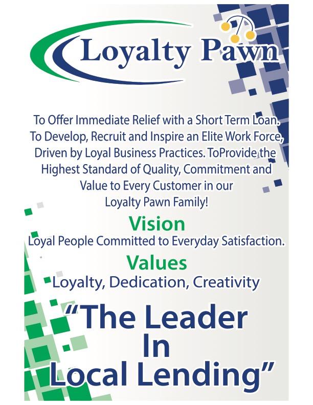 • To Provide the Highest Standard of Quality, Commitment and Value to Every Customer in Our Loyalty Pawn Family!