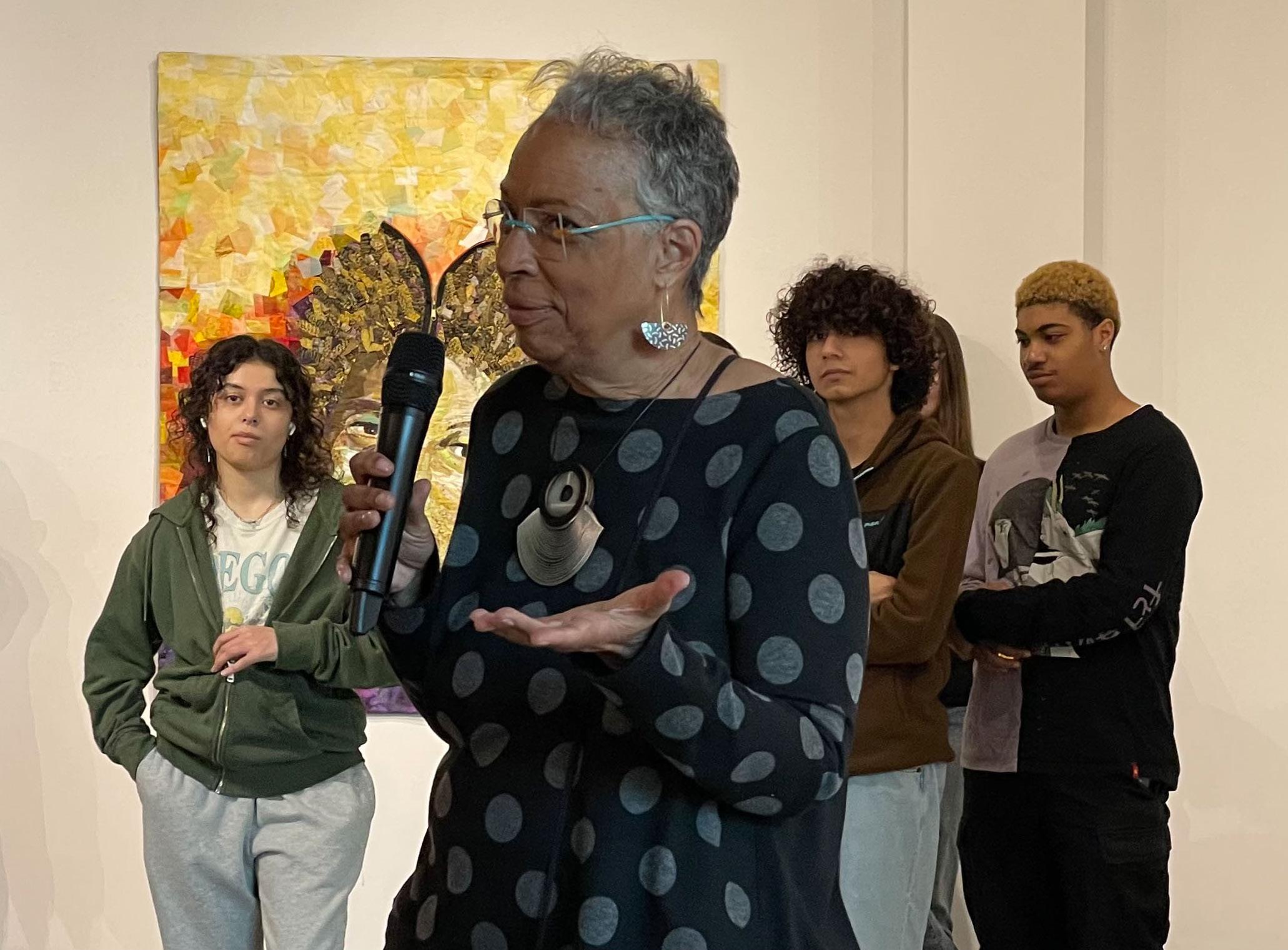Aliyah Ramirez Experience Patience Isch and Bomani Howard viewing Beasley’s quilt art, “Blue Burqas.”