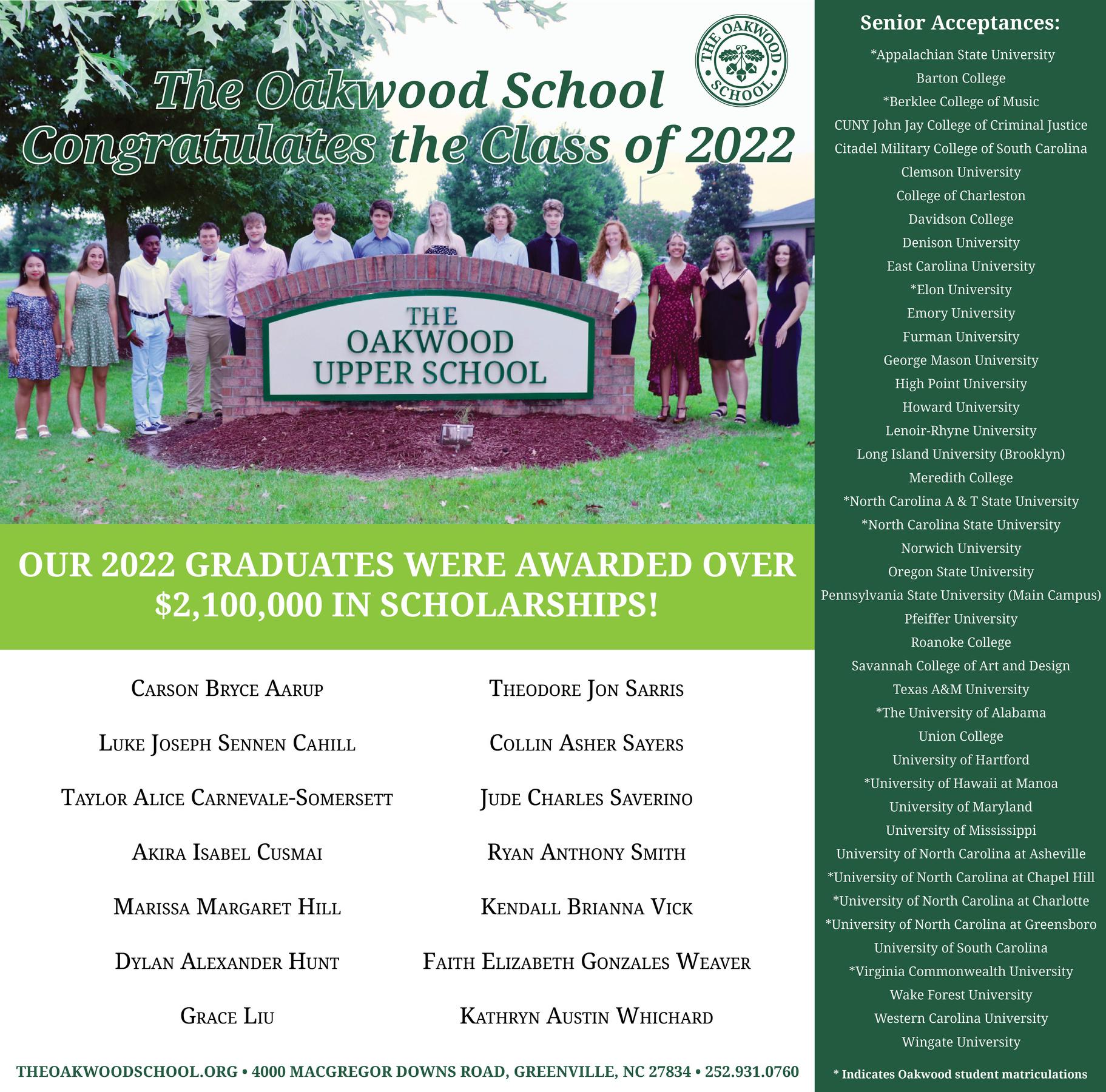 Oakwood’s 27th academic year. During the 2021-2022 school year, we gradually returned to normal operations following COVID-19 as we had a full slate of athletics, live performances of our music concerts and main stage production, Matilda, and the return of popular in-person events like Grandparents and Special Friends’ Day, the International Festival, and a graduation that was fully open to the public. This year is already off to a terrific start with an increase in enrollment and that familiar and warm sense of Oakwood community on campus.