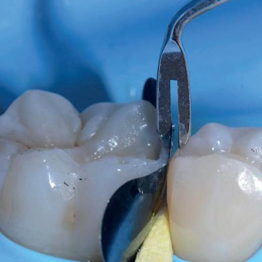 vrstev na zadních výplních. Vidlicový hrot nástroje umožňuje modelovat proximální stěnu tak, aby odpovídala výšce a anatomii sousedního zubu za přítomnosti matrice.