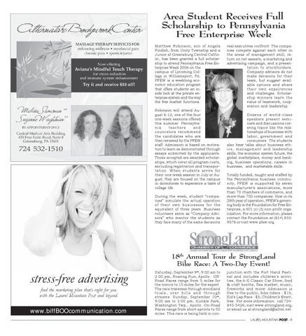 junction with the Fort Hand Festival and includes children’s activities, the A-K Classic Car Show, food & craft booths, flea market, music, fireworks and more! Admission is free to the public; bike riders - $15; Kid’s Lap Race - $5; Children’s Event, free. For more information: call 724845-5426; visit www.strongland.org; or email us at strongland@alltel.net. LAUREL MOUNTAIN POST - 9
