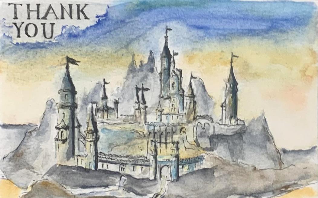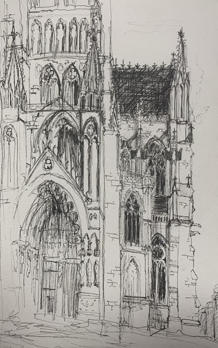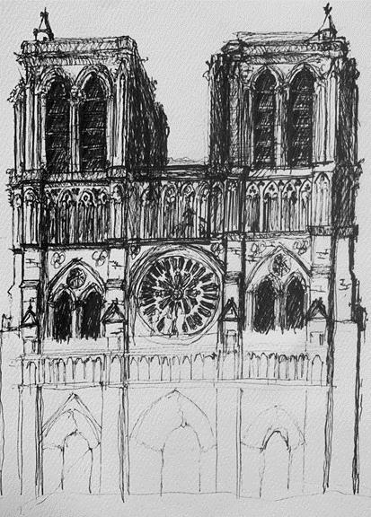 Above: Initial Design Esquisse. My original idea had some more Gothic influences, running with the idea of a French Chateau. Micron pen.