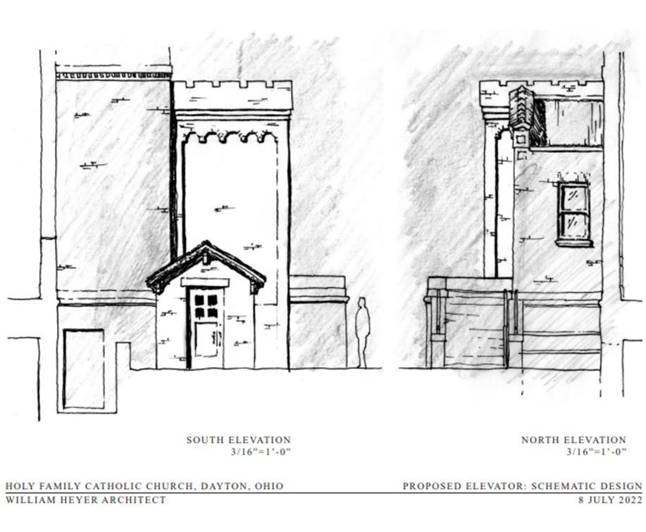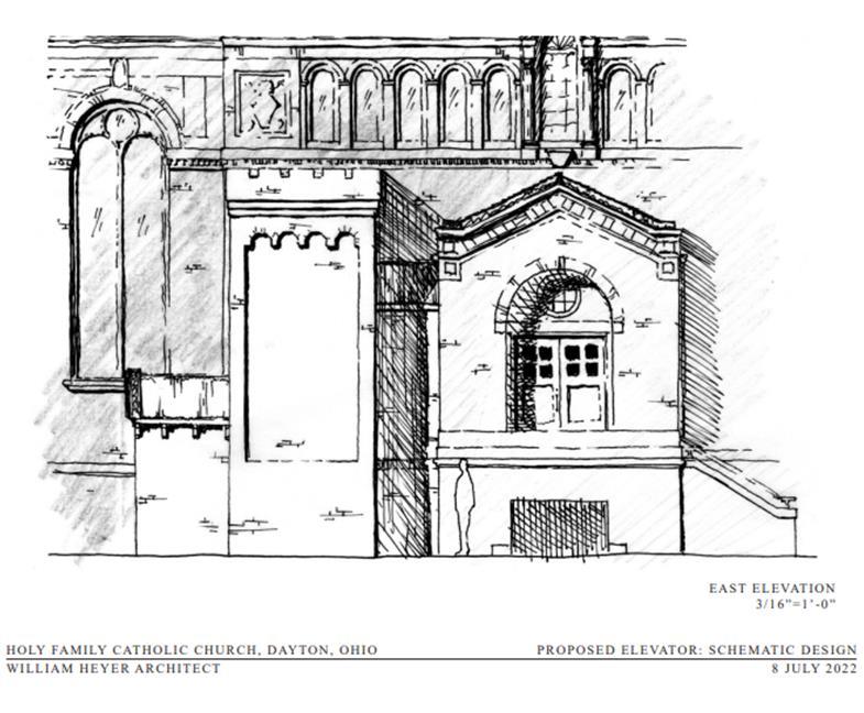Elevator ShaftAddition. Holy Family Catholic Church, Dayton, Ohio. Elevation micron pen renderings traced over CAD drawings.