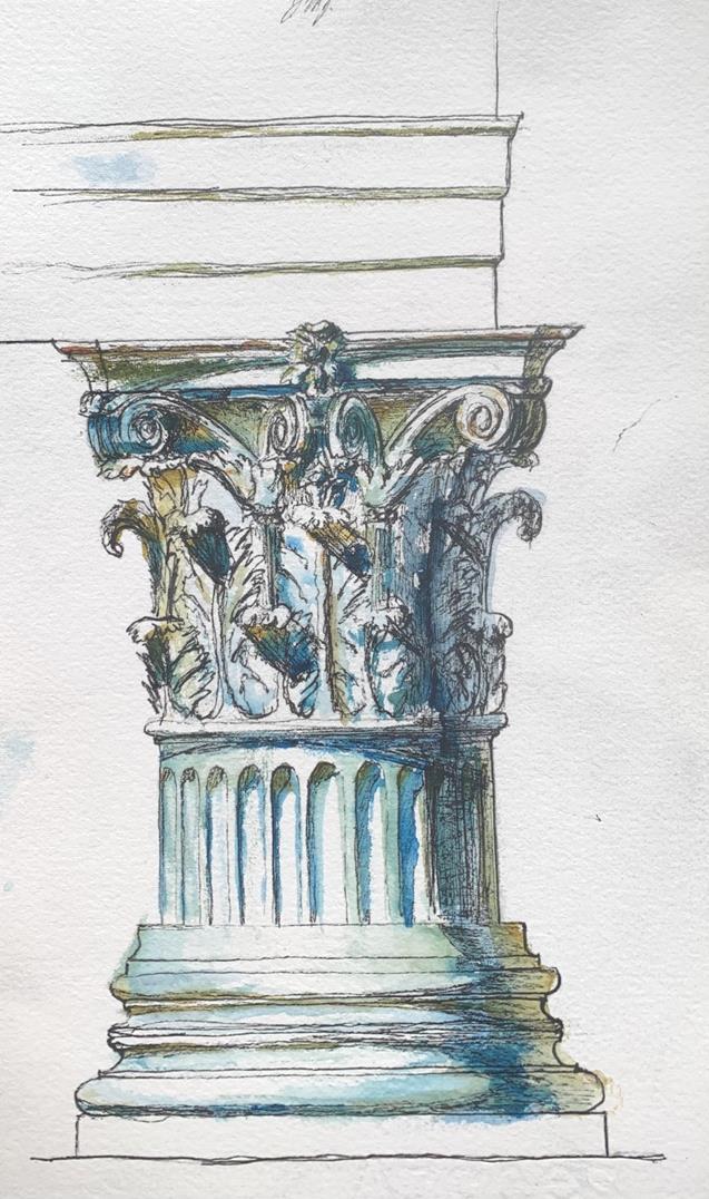 Below: More refined esquisse after removing the Gothic elements.At this point, the design was pretty rudimentary, but all of the main movements were there minus the roof cornice. Micron pen.