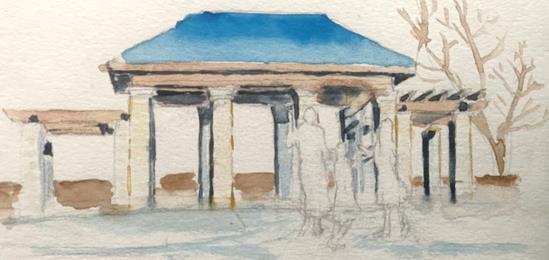 South Elevation. This is the public front people will see on their approach to the building. Watercolor and Ink Wash.