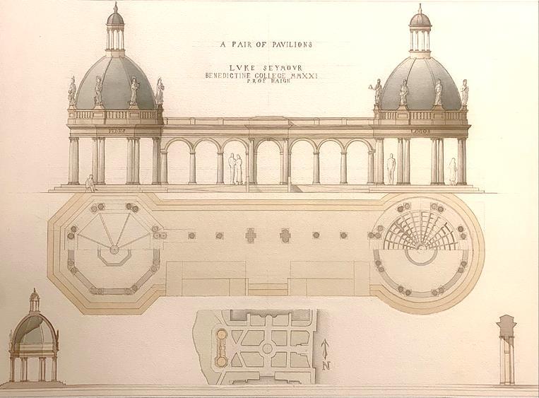 In this project, we were tasked with designing a pair of pavilions with a loggia to cap the open west end of the academic quad at Benedictine College. One pavilion was designed to be circular to represent faith, while the other was octagonal to represent reason, showing their unity. On top of the faith pavilion are the four evangelists, while on the reason pavilion, we have four ancient philosophers.