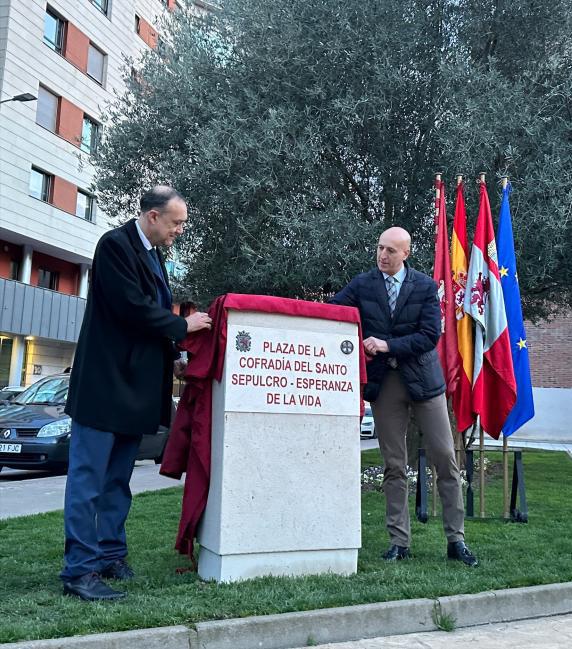 :: El espacio a la entrada de la parroquia de San Froilán se denomina oficialmente ‘Plaza de la Cofradía Santo Sepulcro – Esperanza de la Vida’, tal y como fue aprobado por el pleno del Ayuntamiento de León el pasado 29 de diciembre. Y ayer vivía su puesta de largo en un sencillo acto al que acudieron autoridades –con el alcalde de la ciudad, José Antonio Diez, al frente– y representantes de las cofradías.