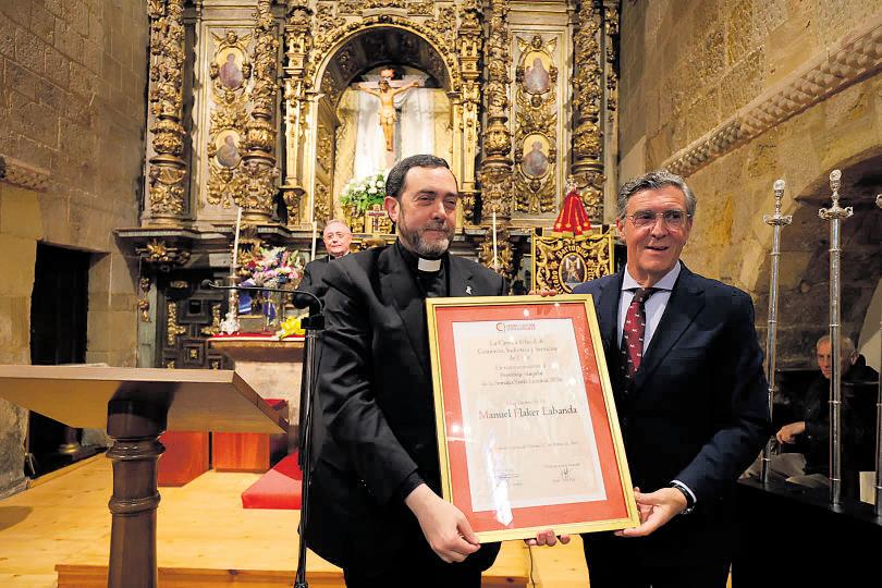 :: Manuel Flaker, párroco del Mercado y de San Martín, consiliario de cuatro cofradías y ex consiliario general para la Junta Mayor –entre otras responsabilidades–; y papón desde hace más de medio siglo, recibía en la iglesia del Mercado el pasado Viernes de Dolores la distinción de ‘Personaje Singular de la Semana Santa’ 2026 por la Cámara de Comercio de León. EN BREVE