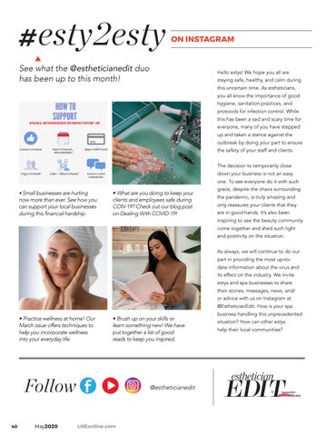 grace, despite the chaos surrounding the pandemic, is truly amazing and only reassures your clients that they are in good hands. It’s also been inspiring to see the beauty community come together and shed such light and positivity on the situation. As always, we will continue to do our part in providing the most up-todate information about the virus and its effect on the industry. We invite estys and spa businesses to share their stories, messages, news, and/ or advice with us on Instagram at @EstheticianEdit. How is your spa