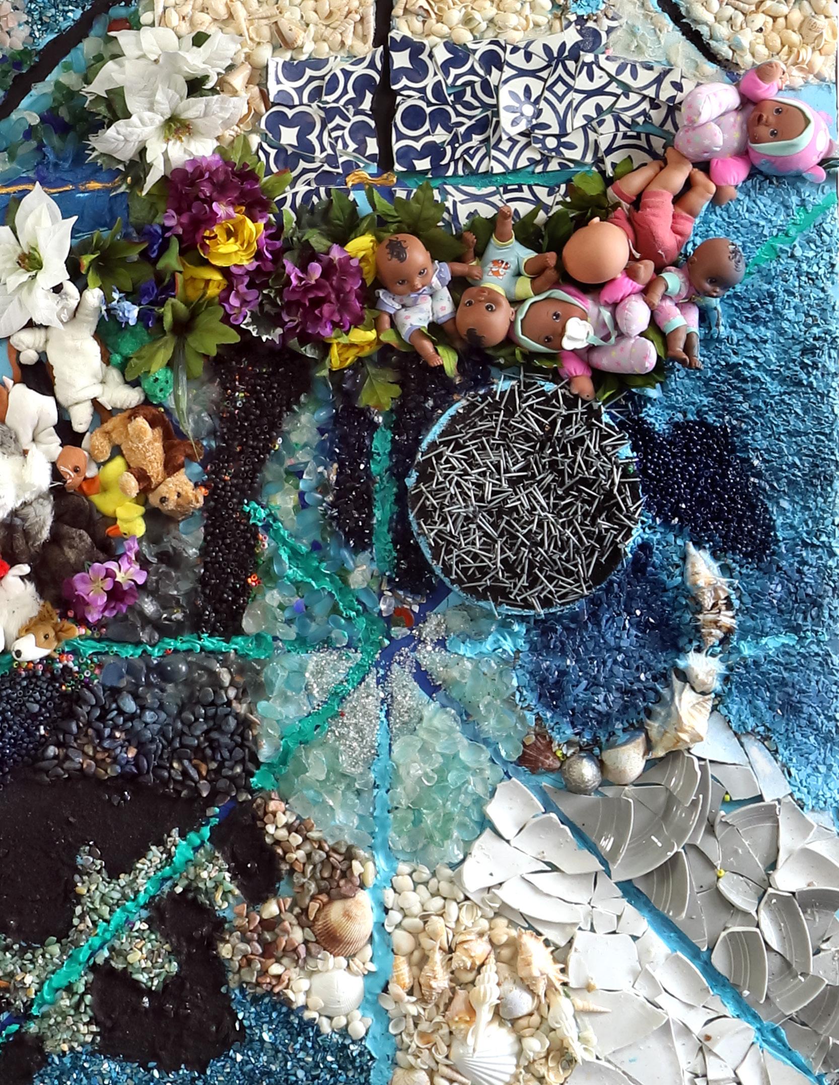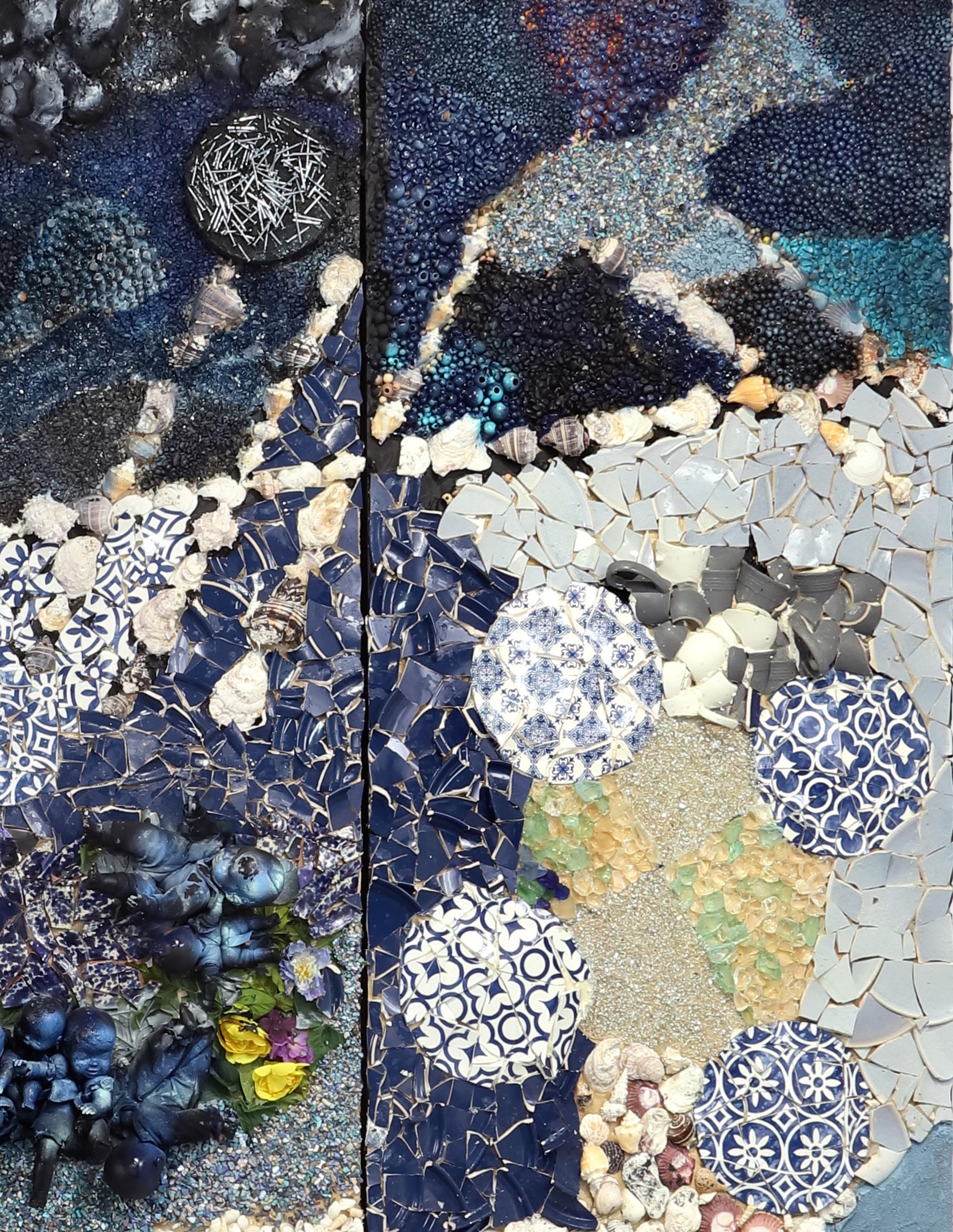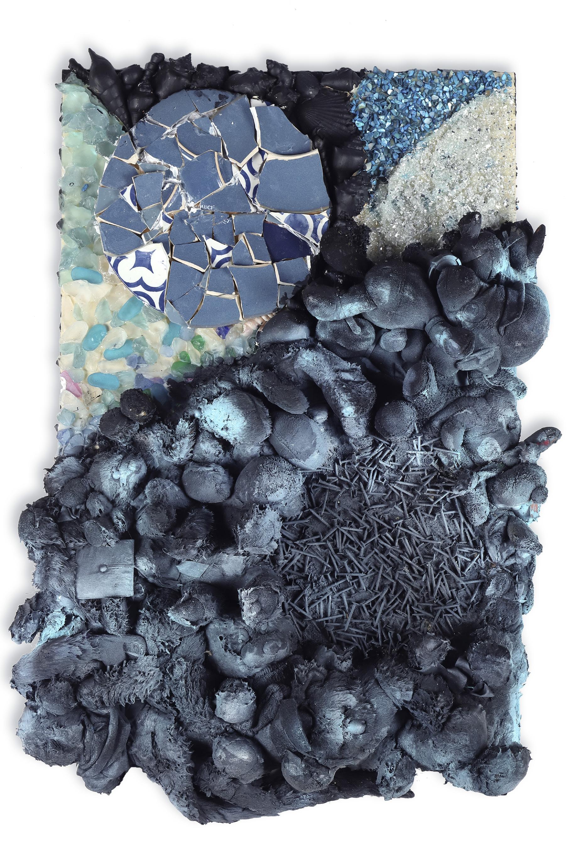 2024, ceramics, seashells, pebbles, railroad spikes, acrylic on wood, 14 x 11 inches, 35.6 x 27.9 cm.