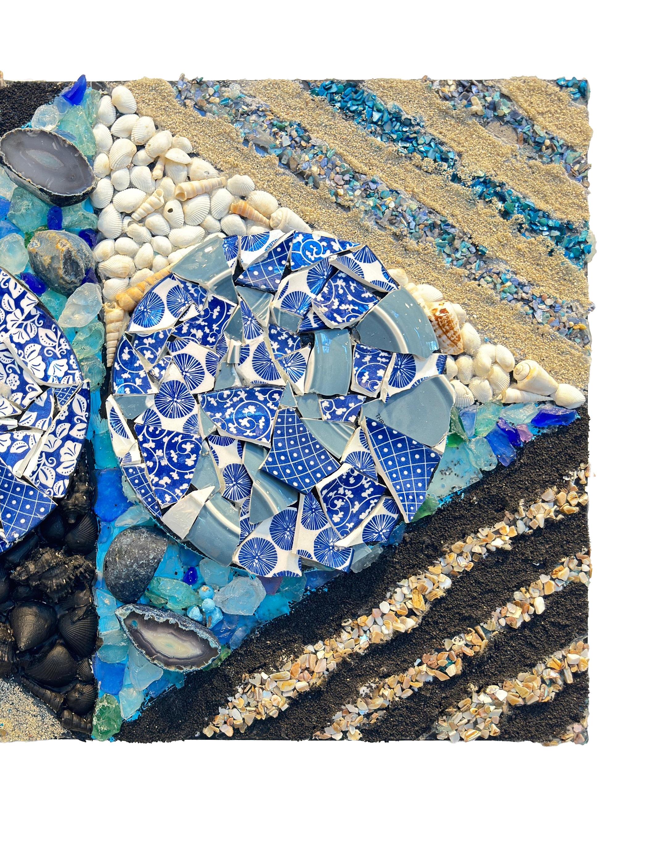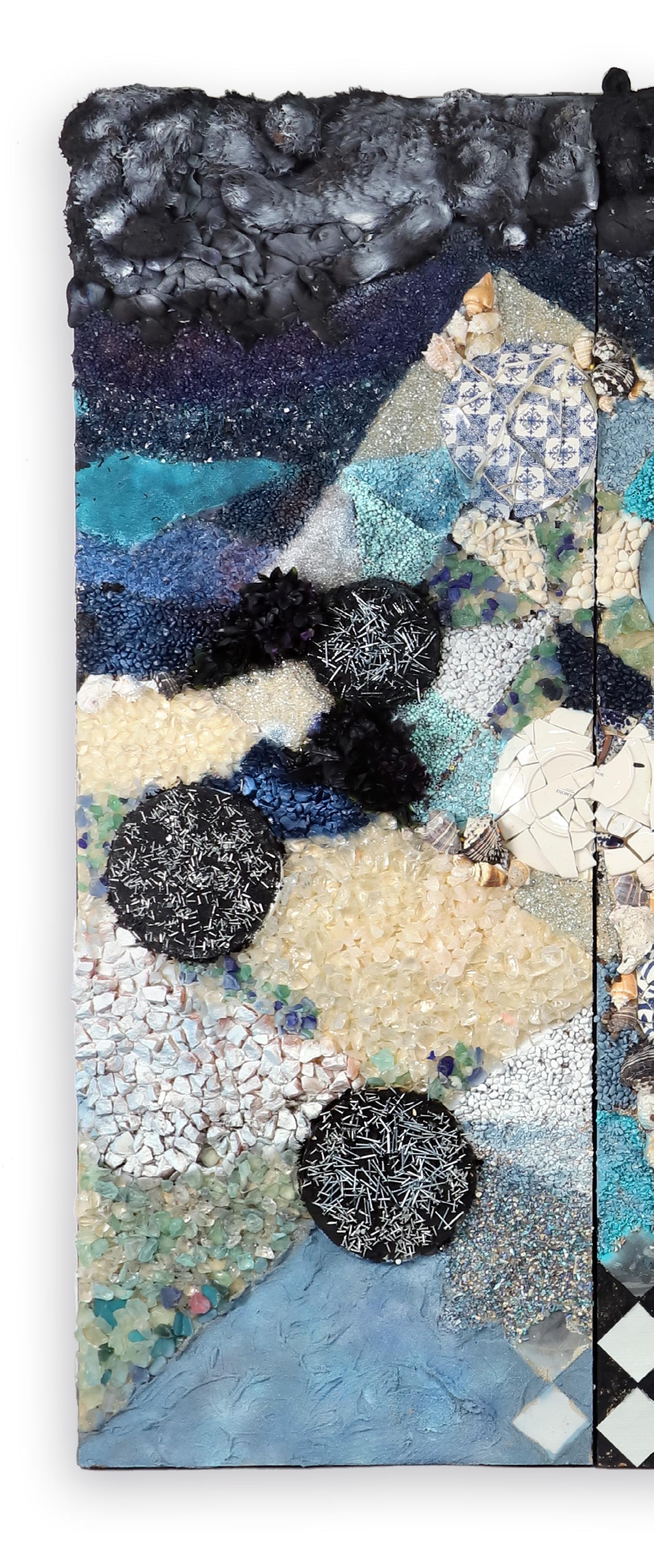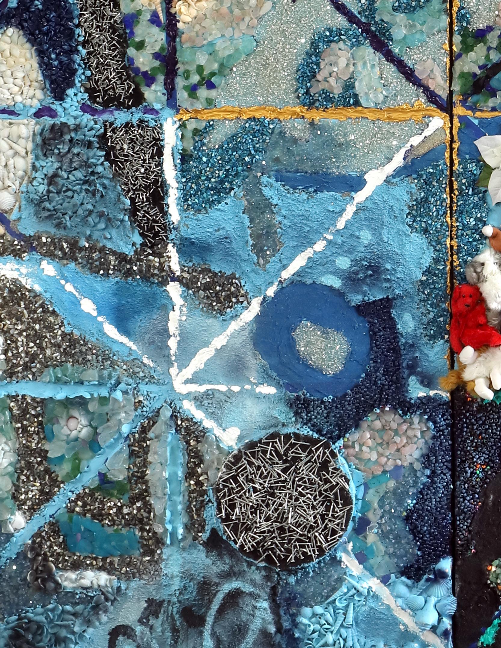 Mansa’s innovative approach, incorporating unconventional elements—teddy bears, nails, sand, seashells, mirrors, sea glass, ceramics, and more—echoes the layered aesthetics of roadside memorials, Southern vernacular sculpture, and West African ritual traditions. At the intersection of painting, fiber art, assemblage, and sculpture, Mansa dissolves boundaries merging symmetry, abstraction, and tactile depth to achieve both spiritual intensity and historical weight. His work honors the endurance and sacrifices of the African diaspora. Drawing on cross-cultural iconography— navigation charts, ritual artifacts, and ancestral symbols—he expands the language of materiality in ways that recall the legacy of Thornton Dial, Chakaia Booker, and Theaster Gates.