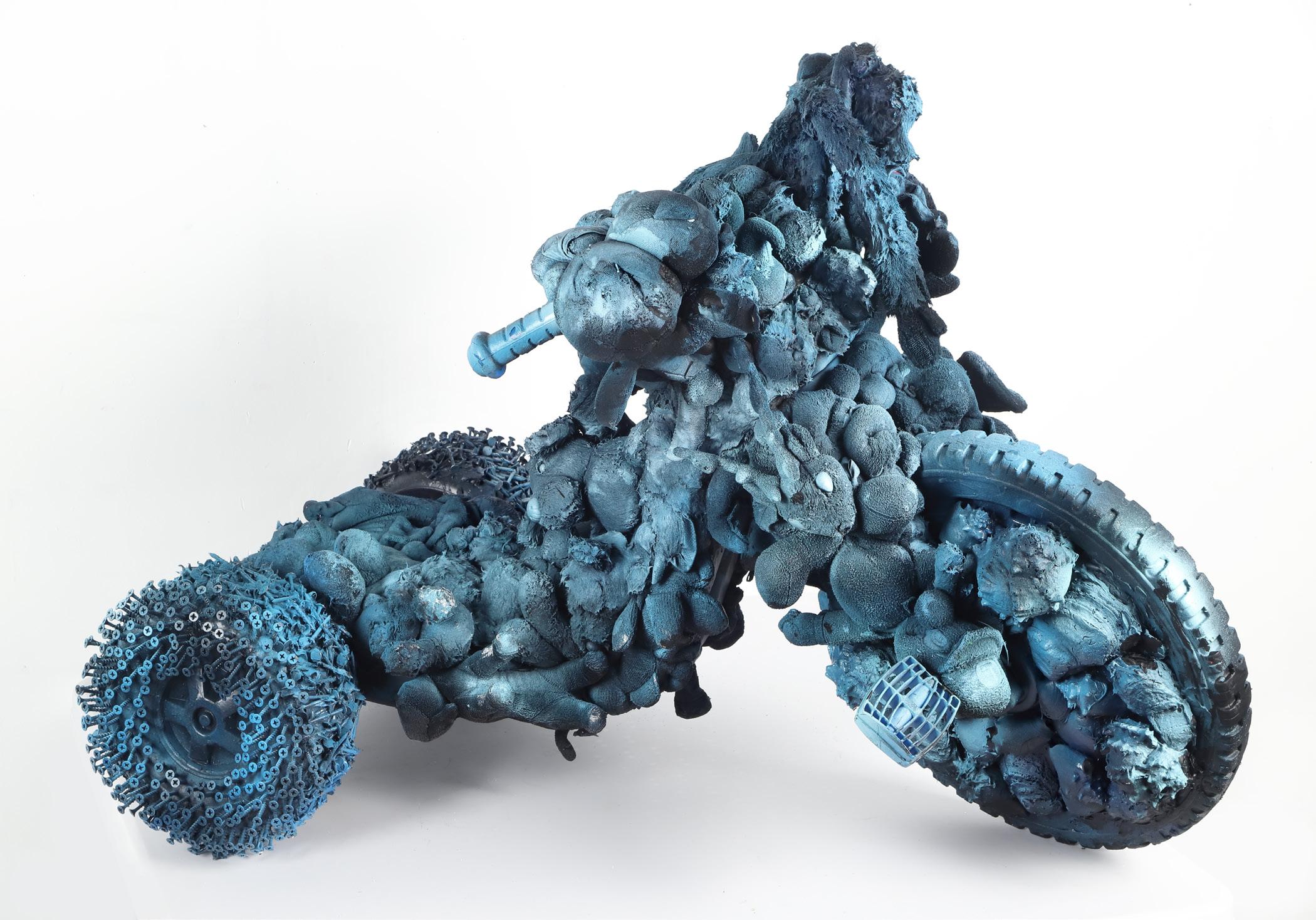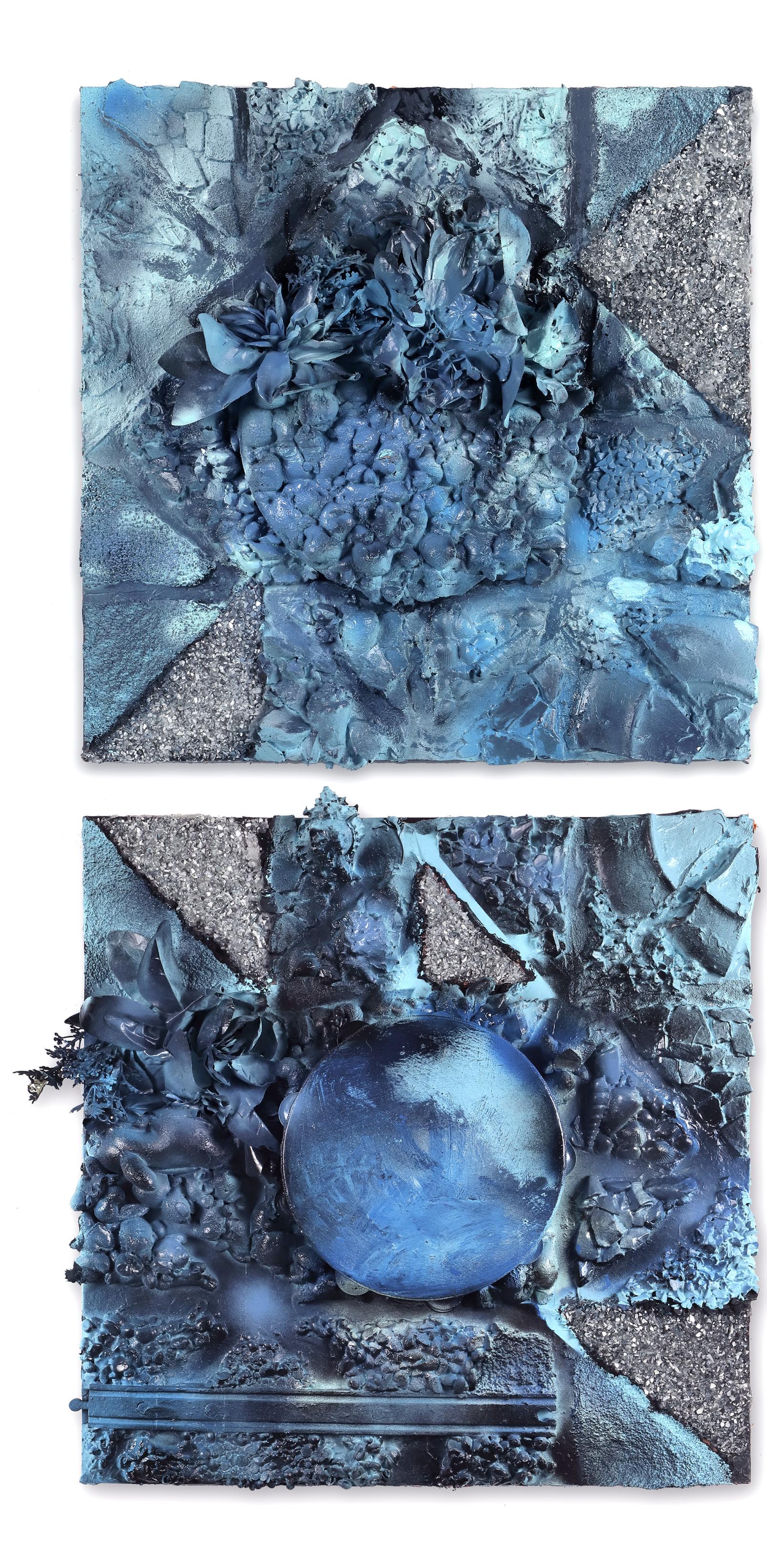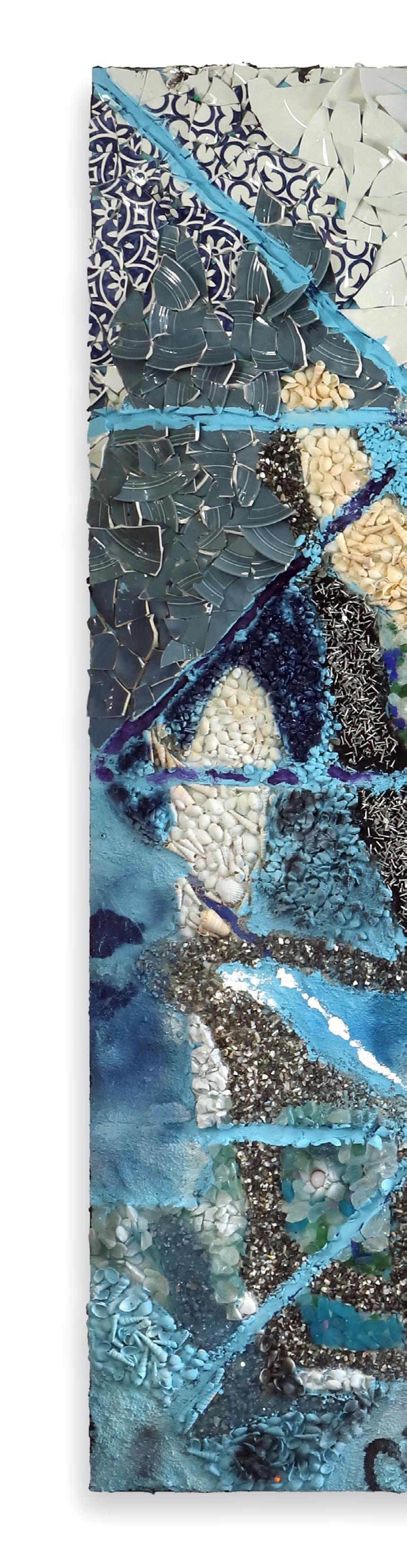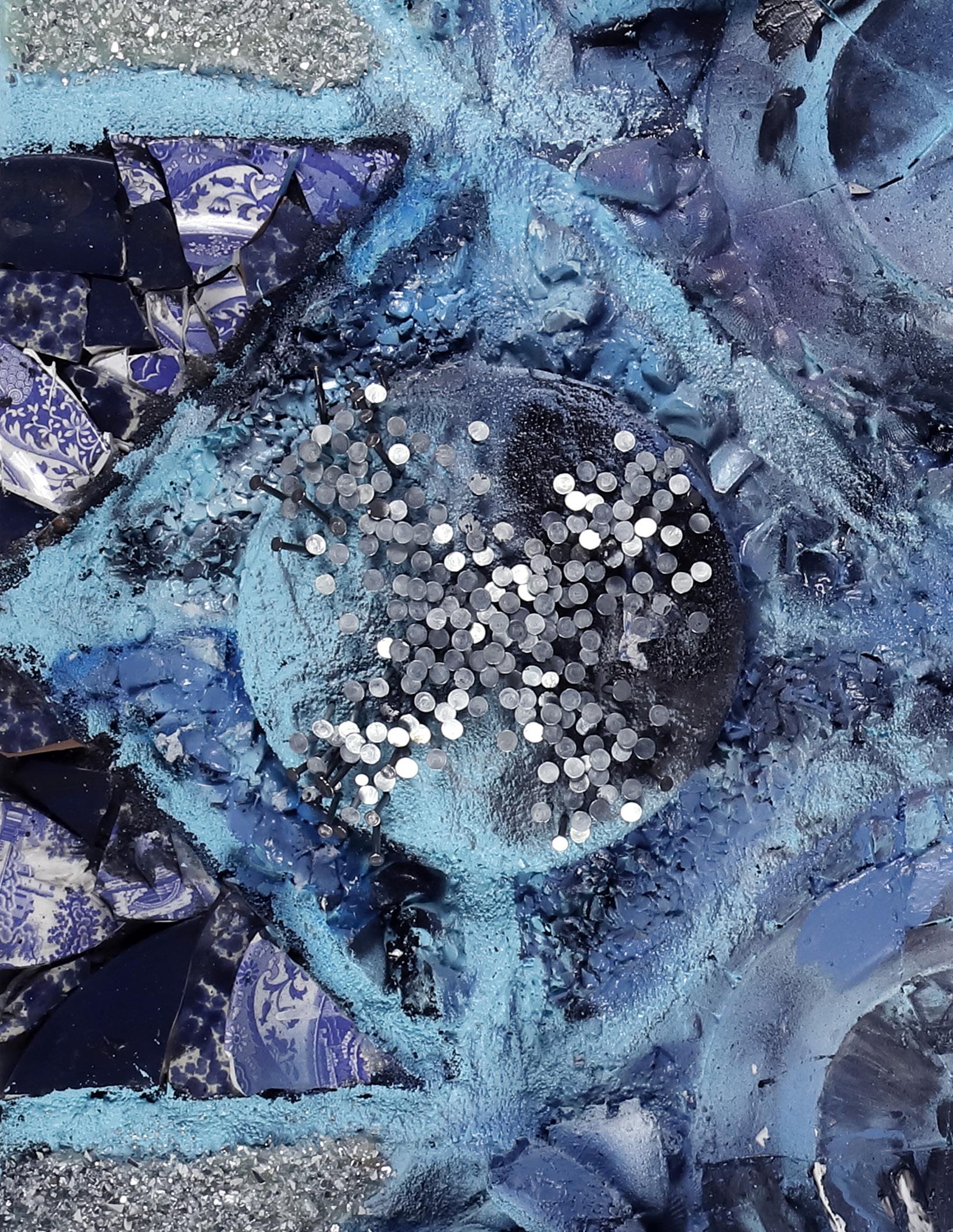 Mansa’s innovative approach, incorporating unconventional elements—teddy bears, nails, sand, seashells, mirrors, sea glass, ceramics, and more—echoes the layered aesthetics of roadside memorials, Southern vernacular sculpture, and West African ritual traditions. At the intersection of painting, fiber art, assemblage, and sculpture, Mansa dissolves boundaries merging symmetry, abstraction, and tactile depth to achieve both spiritual intensity and historical weight. His work honors the endurance and sacrifices of the African diaspora. Drawing on cross-cultural iconography— navigation charts, ritual artifacts, and ancestral symbols—he expands the language of materiality in ways that recall the legacy of Thornton Dial, Chakaia Booker, and Theaster Gates.