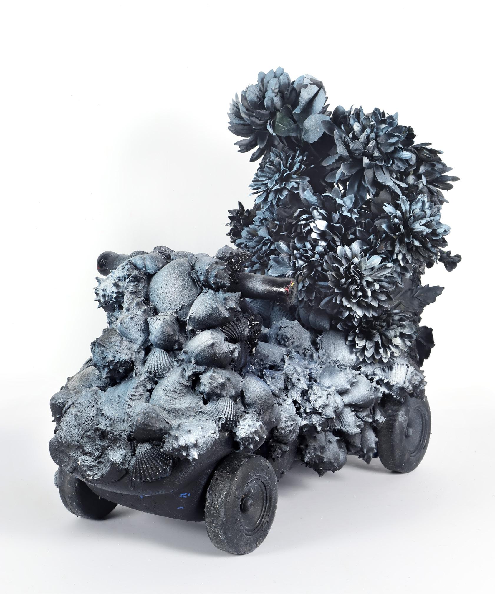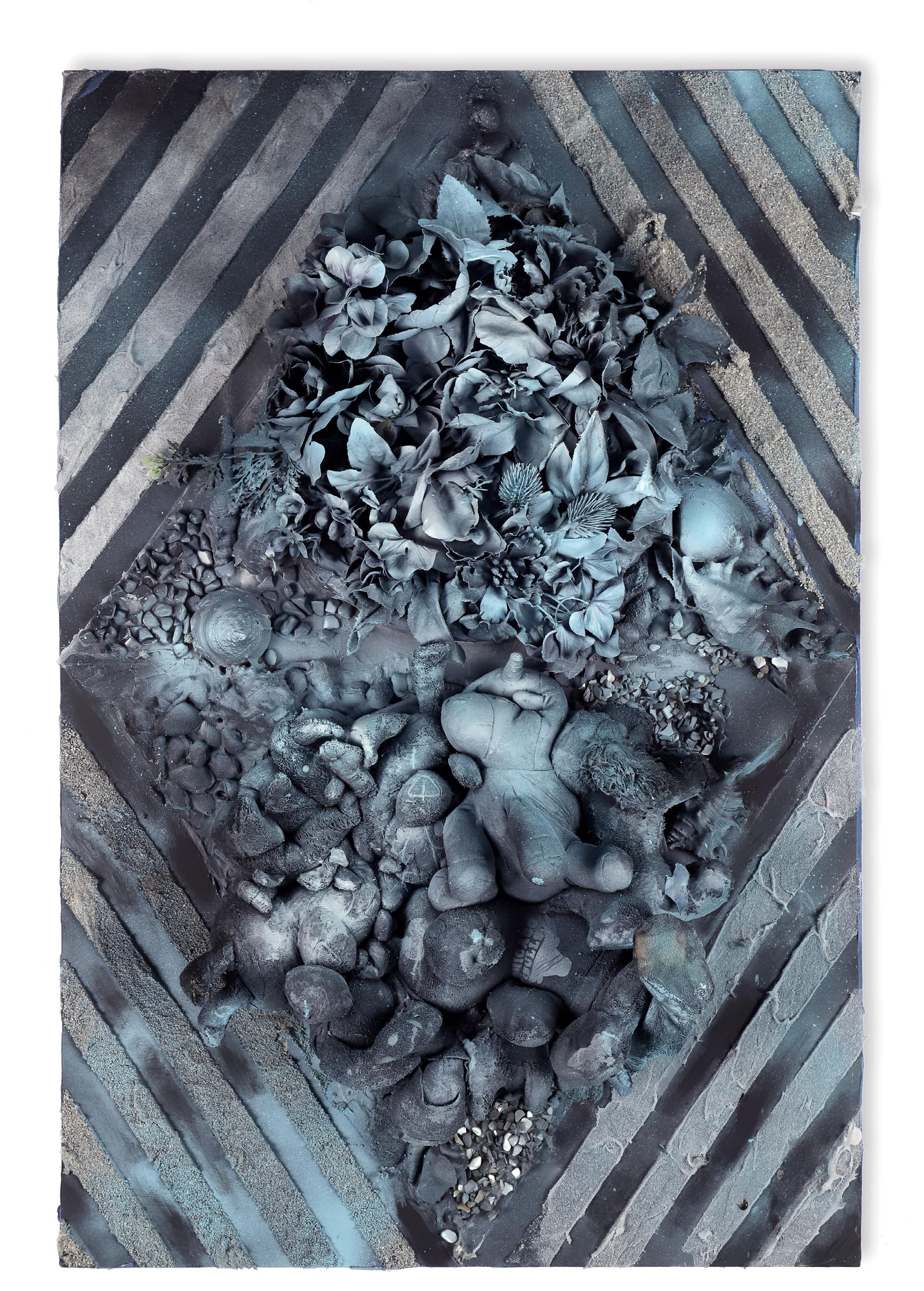 2024, ceramics, pebbles, railroad spikes, plastic flowers, acrylic on wood, 14 x 11 inches, 35.6 x 27.9 cm.