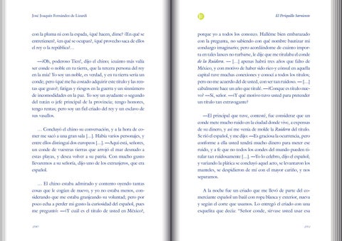 con la pluma ni con la espada, ¿qué hacen, dime? ¿En qué se entretienen?, ¿en qué se ocupan?, ¿qué provecho saca de ellos el rey o la república?… —¡Oh, poderoso Tien!, dijo el chino; ¡cuánto más valía ser conde o noble en tu tierra, que la tercera persona del rey en la mía! Yo soy un noble, es verdad, y en tu tierra sería un conde; pero ¿qué me ha costado adquirir este título y las rentas que gozo?; fatigas y riesgos en la guerra y un sinnúmero de incomodidades en la paz. Yo soy un ayudante o segundo del tután o jefe principal de la provincia; tengo honores, tengo rentas; pero soy un fiel criado del rey y un esclavo de sus vasallos. … Concluyó el chino su conversación, y a la hora de comer me sacó a una gran sala […]. Había varios personajes, y entre ellos distinguí dos europeos […]. —Aquí está, señores, un conde de vuestras tierras que arrojó el mar desnudo a estas playas, y desea volver a su patria. Con mucho gusto llevaremos a su señoría, dijo uno de los extranjeros, que era español. … El chino estaba admirado y contento oyendo tantas cosas que le cogían de nuevo, y yo no estaba menos, considerando que me estaba granjeando su voluntad; pero por poco echa a perder mi gusto la curiosidad del español, pues me preguntó: —¿Y cuál es el título de usted en México?, 280