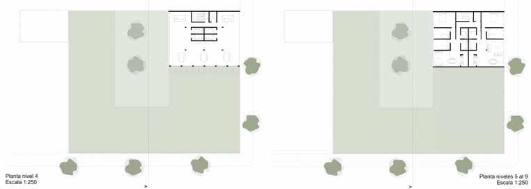 Es así que se plantea un abordaje del proyecto identi cando diferentes niveles de permeabilidad con respecto a la vía pública, siendo los niveles inferiores los más “públicos”, escalando a programás de habitar colectivo y servicios de índole privada.