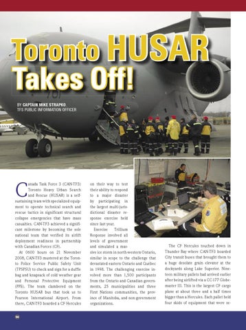 anada Task Force 3 (CAN-TF3) Toronto Heavy Urban Search and Rescue (HUSAR) is a selfsustaining team with specialized equipment to operate technical search and rescue tactics in significant structural collapse emergencies that have mass casualties. CAN-TF3 achieved a significant milestone by becoming the sole national team that verified its airlift deployment readiness in partnership with Canadian Forces (CF). At 0600 hours on 21 November 2008, CAN-TF3 mustered at the Toronto Police Service Public Safety Unit (TPSPSU) to check and sign for a duffle bag and knapsack of cold weather gear and Personal Protective Equipment (PPE). The team clambered on the Toronto HUSAR bus that took us to Pearson International Airport. From there, CAN-TF3 boarded a CF Hercules 50