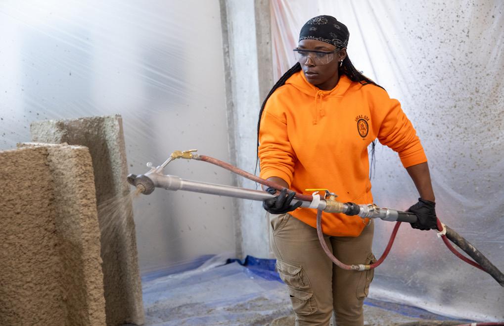Victoria currently performs production gun spraying to fireproof new construction for Massachusetts General Hospital. The most exciting part of the MGH job for her is that she has worked on it from the start of the project and is seeing her work integrated into the final product. She completed her four-year apprenticeship with Boston Local 534 learning every aspect of the job: plastering, skin coating and ornamental work.