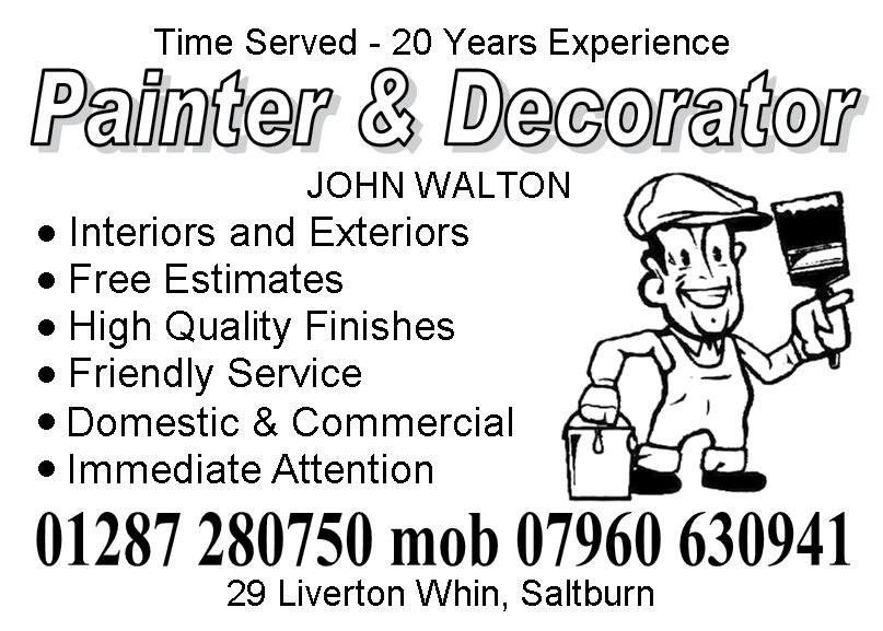 local-answer.co.uk | Tel: 07525 856882 or 07732 403731 Page 5 Carefully distributed by Famous Flyers to Redcar, East Cleveland, Ingleby Barwick & surrounding areas M & B Decorating For all your decorating needs 32 years experience Furniture upcycling Call today for a FREE estimate Contact Mick on 01287 624007 / 07758 852591 Check out our website at: www.cutstyresandexhausts.co.uk Just Good Service NO GIMMICKS NO HASSLE MOT’S SERVICING BATTERIES TRACKING BOSCH Air Conditioning Service and Re-Gas from £45 MOT’s £39 FREE Delivery and Collection Service FREE Fitting, Balance and Valves with all tyres SPECIAL OFFER Wheel Alignment 4 Wheels...£60 2 Wheels...£30 01287 644441 CUTS tyres& exhausts THE GARAGE, BROTTON RD, CARLIN HOW TS13 4DY FREE Re-tests BUILDING A STAR If you are looking for professional builders in the Saltburn-by-the-Sea area, call the team at A STAR BUILDING today Call 07917 403517 or 01287 659236 30+ Years Experience astarbuilding@yahoo.co.uk Home Extensions • Property Maintenance • Landscaping Experts CLEVELAND FOOT CARE MOBILE CLINIC Professional Foot Health in your own Home • Toe Nail Cutting • Painful Corns • Fungal Nails • Hard Skin Removal • Diabetic Foot Care • Ingrowing Toenails SHIRLEY DICKINSON MAFHP, MCFHP Foot Health Practitioner Fully Insured & CRB Checked How can I help? 07507 422004 tsdickinson5057@gmail.com www.clevelandfootcare.co.uk