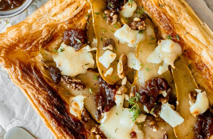 Roll out puff pastry in a tart tin. Layer slices of pear with crumbled goat cheese and toasted walnuts. Drizzle with honey and bake at 200°C (400°F) for 20–25 minutes.